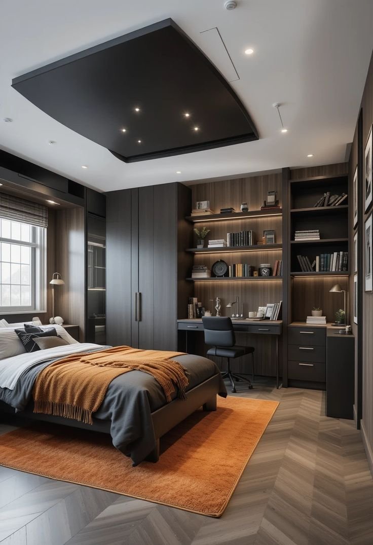 غرفة النوم المينيمالية (Minimalist): السر هنا هو الإضاءة المدمجة. اعتمد على الإضاءة المخفية في السقف أو خلف اللوح الأمامي للسرير. استخدم أباليك جدارية ذات تصميم نظيف وبسيط. يمكن للإضاءة الخطية (Linear Lighting) المدمجة في الجدار أن تكون حلاً فنيًا رائعًا.